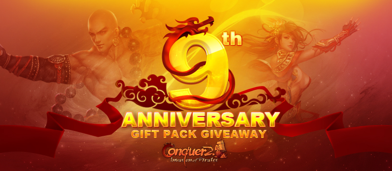 To celebrate the ninth anniversary of Conquer Online, we are teaming up with 91.com and Netdragon to distribute 2000 Free Luxury Gift Packs to new users in the game.1. Upgrade Pack: 2 EXP Potions every 5 levels, 2 EXP Balls every 10 levels and a Praying Stone every 20 levels for level 15 to level 120.