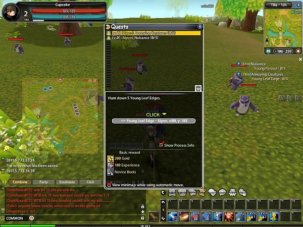 There is a fair amount of quests in the game. I liked that there were enough quests each lvl to help me get to the next and as soon as I leveled I got a new set of quests I could finish. The rewards are also quite nice and the amount of gold you receive as well as experience is fair. There are also repeat quests that you can get from bulletin board and party quests. And what every player loves auto walk. Not only does the game lead you to the monster you need to kill but it also leads you back to the NPC you need to turn that quest in. You can see on your right side of the screen a small box that tells you how much more items you need to collect before you can finish that quest.